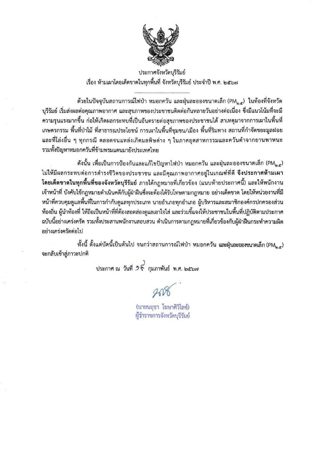 ประชาสัมพันธ์ ประกาศจังหวัดบุรีรัมย์ เรื่องห้ามเผาเด็ดขาดในทุกพื้นที่จังหวัดบุรีรัมย์ ประจำปี พ.ศ.2567 ขอความร่วมมืองดเผาในที่โล่งและพื้นที่เกษตรกรรม เพื่อช่วยกันลดการเกิดฝุ่นละออง PM 2.5 โดยจังหวัดบุรีรัมย์ ได้มีประกาศห้ามเผาโดยเด็ดขาดในทุกพื้นที่ของจังหวัดบุรีรัมย์ ภายใต้กฎหมายที่เกี่ยวข้อง (แนบท้ายประกาศนี้) และให้พนักงานเจ้าหน้าที่ บังคับใช้กฎหมายดำเนินคดีกับผู้ผ่าฝืนซึ่งจะต้องได้รับโทษตามกฎหมาย อย่างเด็ดขาด โดยให้หน่วยงานที่มีหน้าที่ควบคุมดูแลพื้นที่ในการกำกับดูแลทุกประเภท นายอำเภอทุกอำเภอ ผู้บริหารและสมาชิกองค์กรปกครองส่วนท้องถิ่น ผู้นำท้องที่ ให้ถือเป็นหน้าที่ที่ต้องสอดส่องดูแลเอาใจใส่ และร่วมขี้แจงให้ประชาชนในพื้นที่ปฏิบัติตามประกาศฉบับนี้อย่างเคร่งครัด รวมทั้งประสานพนักงานสอบสวน ดำเนินการตามกฎหมายที่เกี่ยวข้องกับผู้ฝ่าฝืนกระทำความผิดอย่างเคร่งครัดต่อไป
